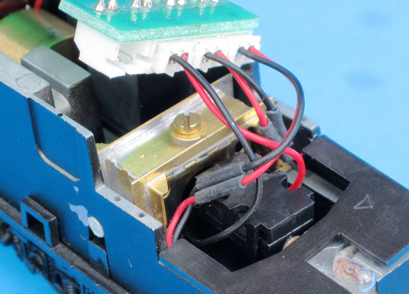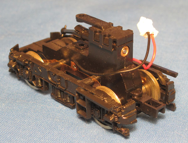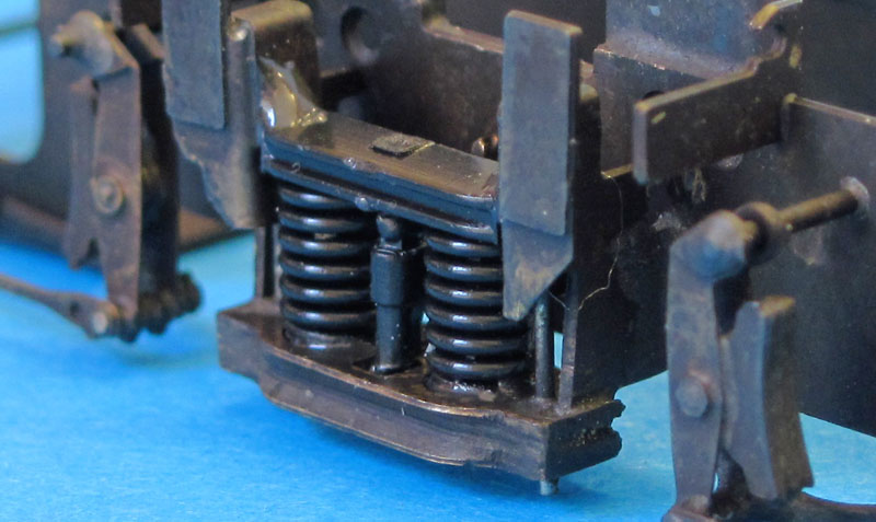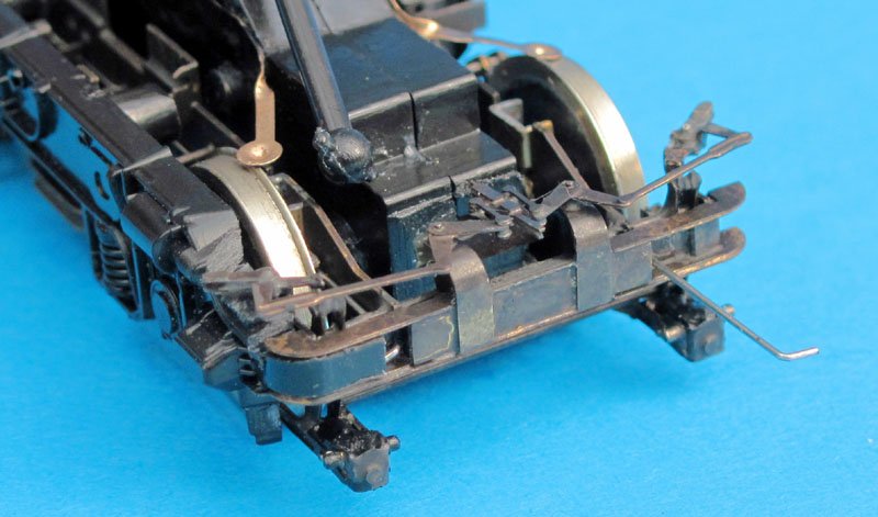 Bogie secured to locomotive chassis block by a simple etched frame, with correct pivot location (as manufactured, the pivot points are moved in towards the centre of the model).